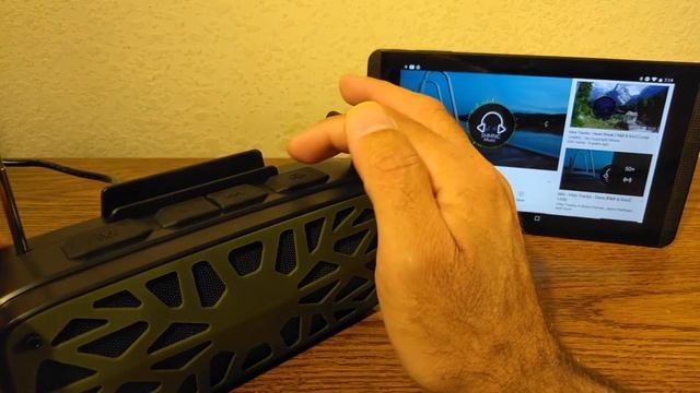 This is the Brookstone TravelTunes Bluetooth Speaker (Travel Tunes) that has FM Radio, and can play music from a bluetooth connection, or from either a TF card or Flash memory (not included, obviously). Great simple device, very basic sound quality, but for $20 a can live with it.