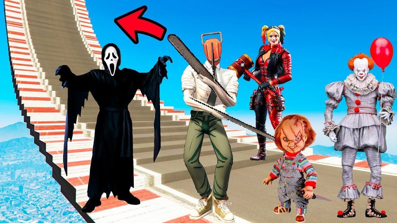 КАК ДАЛЕКО ЧЕЛОВЕК БЕНЗОПИЛА И КРИК СМОГУТ ПРОЙТИ ПО СТУПЕНЬКАМ ЛЕСТНИЦЫ В ГТА 5 МОДЫ! ЭКСПЕРИМЕНТЫ
