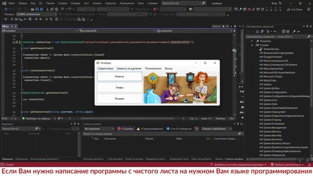 https://kursovik.com/programming/101450420.html Автоматизированная информационная система «Ломбард». Среда разработки: Visual Studio. Технология разработки: WindowForms. Среда программирования: Visual C# .NET 2020. База данных: MySQL. Программа для ломбарда представляет собой систему управления данными, предназначенную для организации работы с товарами, клиентами, продажами и пользователями. Видеоинструкция: развёртывание базы данных MySQL из ранее сохранённых файлов через MySQL Workbench: https://rutube.ru/video/94f0526f661fa54460c90177e10355bc/?playlist=753123 Приобрести исходники(все файлы проекта) данной программы Вы можете, заполнив следующую форму: https://kursovik.com/programming/101450420.html?camefrom=rutube#form Заказать отчёт(описание): https://kursovik.com/programming/101450420.html?camefrom=rutube#pz_need Заказать модификацию: https://kursovik.com/uniform.html?modify=101450420&camefrom=rutube Заказать новую программу: https://kursovik.com/programming_order.html?camefrom=rutube Задать вопрос автору: https://kursovik.com/programming/101450420.html?camefrom=rutube#vopros Наш Телеграм-БОТ для поиска готовых работ по программированию https://t.me/kursovikcom_bot , в нашей базе более 5и тысяч готовых работ, для более эффективного поиска используйте наш Телеграм-БОТ. Список наших готовых работ по программированию: https://kursovik.com/progtopic.html?camefrom=rutube Разработка программ на заказ согласно Вашему заданию: https://kursovik.com/programming_order.html?camefrom=rutube Мы пишем программы практически на всех языках программирования, работаем с различными базами данных, выполняем как мелкие задачки, так и крупные проекты. Разрабатываем и запускаем в работу ЧАТ-БОТы. Обращайтесь - всегда будем рады Вам помочь! Если нужно переписать данную программу на другой язык программирования - обращайтесь - сделаем. Адрес нашего сайта: https://kursovik.com Наши контакты: https://kursovik.com/contacts.html Наша группа ВК: https://vk.com/kursovik (всем подписчикам скидка 5%) Наш Телеграм-канал: https://t.me/kursovik (всем подписчикам скидка 5%) Наш Дзен-канал: https://dzen.ru/kursovik (всем подписчикам скидка 5%) Наш RuTube-канал: https://rutube.ru/channel/41864889 (всем подписчикам скидка 5%) Наш YouTube-канал: https://youtube.com/@kursovik_com (всем подписчикам скидка 5%) (скидки не суммируются :-) #курсоваяработа #базыданных #visualstudio #программирование