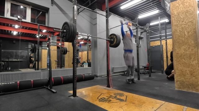 Техника Каждые 60 секунд, 10 подходов 1 рывок в стойку Каждые 60 секунд, 10 подходов 1 рывок в сед В идеале - доходим за 10 подходов до тяжелого веса в стойку, и на 11 минуте начинаем работать в сед. * 60 (кг) Сила Чередуя каждые 2,5 минуты, 15 минут 11 приседаний со штангой на груди Максимум строгих подтягивания Приседания без долгих пауз, быстро, технично. Вес - прошлой недели, добавляем повтор. Подтягивания - заканчиваем, когда нужно сделать паузу внизу. Если 15+ до подбородка легко - делаем до груди. * 80 (кг) 3х10 (повторения) Комплекс 9AMRAP 7 подносов ног 6 махов гирей 16-24 кг 5 прыжков на коробку или 9AMRAP 15 подносов ног 10 становых тяг 50/35 кг 5 рывков * 121 (повторения) Вообще не дышалось