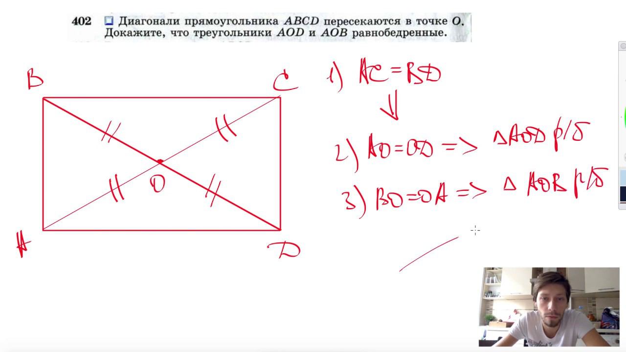 №402. Диагонали прямоугольника ABCD пересекаются в точке О. Докажите, что треугольники AOD и АОВ равнобедренные. Поддержать канал рублём - 5469400944002125 (Сбербанк) Мой второй канал для подготовки к ЕГЭ и ОГЭ - https://www.youtube.com/ЕвгенийСумин Инстаграм - https://www.instagram.com/EGE_OGE.math Личный инстаграм - https://www.instagram.com/ee_sumin VK - https://vk.com/evgeniysumin FB - https://www.facebook.com/EvgeniySumin