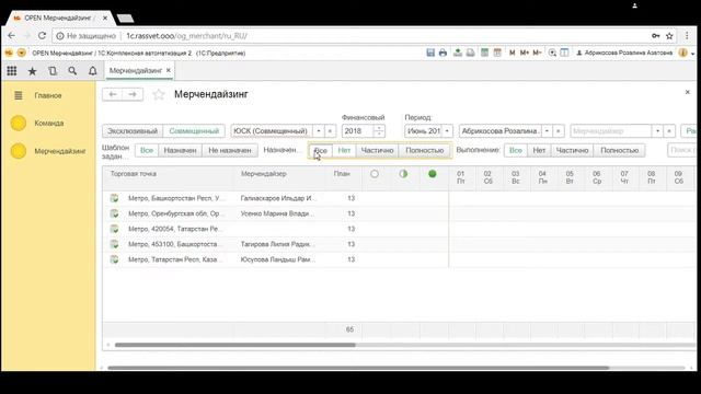 0:13 Для работы с визитами необходимо зайти в меню Мерчендайзинг журнал Мерчендайзинг. Работа с основными фильтрами: 0:21- Фильтр Тип проекта. 0:42 - Фильтр Проект. 1:22 - Фильтр Финансовый период. 1:35 - Фильтр Период. 2:14 - Фильтр Супервайзер. 2:55 - Перемещение по окну расстановки. 3:15 - Перемещение по журналу Мерчендайзинг. 3:32 - Работа с дополнительными фильтрами: 3:43 - Фильтр Шаблон задания. 3:55 - Фильтр Назначение. 4:51 - Фильтр Выполнение. 5:57 - Поля табличной части с автоматическим заполнением: 6:06 - Поле Торговая точка. 6:19 - Поле Мерчендайзер. 6:59 - Поле План. 7:27 - Поле Визит назначен. 8:20 - Поле Визит выдан. 8:36 - Поле Визит выполнен. 8:46 - Инфографика. Расшифровка цветовых значений (инфоргафика) по визитам доступна при нажатии на кнопку Знак вопроса. 9:21 - Поля табличной части с возможностью изменения. 9:23 - Поля, предназначенные для расстановки мерчендайзеров по торговым точкам.