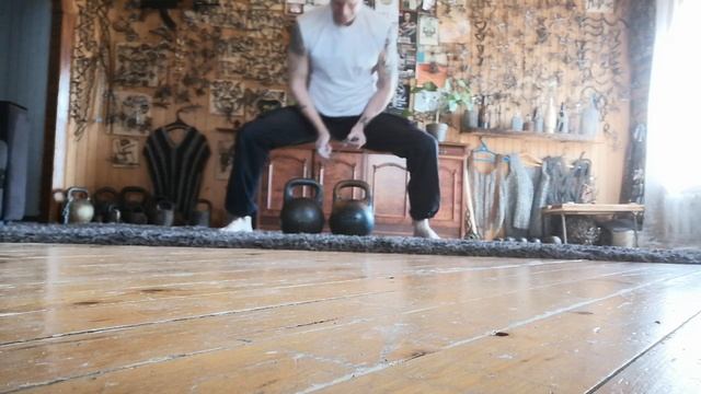 На шпагате с гирями по 24 кг, на запястиях, согнул гвоздь 200. 6, голые руки