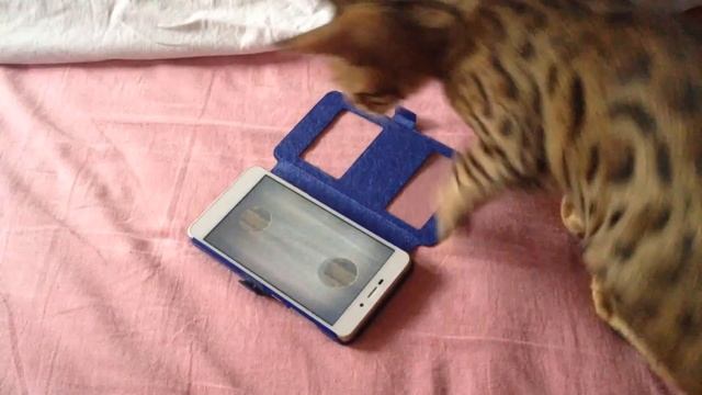Бенгальский котёнок развлекается с телефоном