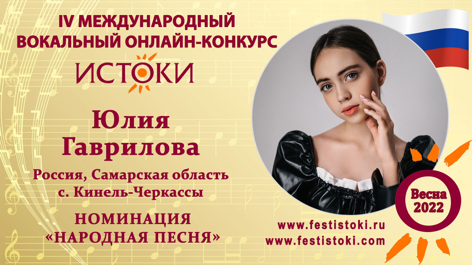 Лауреат II степени IV Международного вокального онлайн-конкурса «Истоки».Весна-2022. Номинация "Народная песня". Песня "Ай, вы цыгане" Слова и музыка народные. Сайт: www.festistoki.ru / www.festistoki.com E-mail: festistoki@mail.ru
