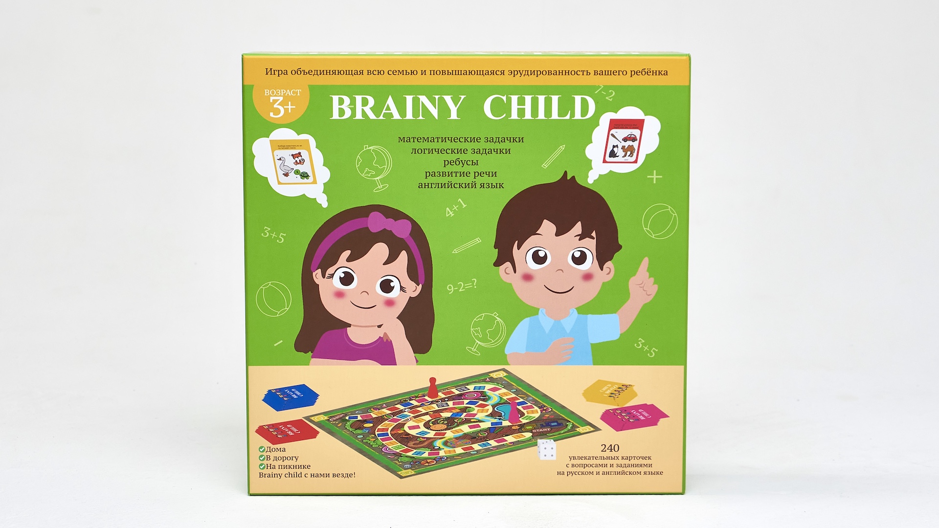 Не знаете, чем занять своего ребенка в дороге или что купить в подарок на день рождения? Отличным вариантом будет развивающая настольная игра для детей Brainy Child. Логическая игра предназначена для детей от трех лет. Подходит для компании, состоящей из шести детей, но также в нее можно играть и на двоих. В яркой коробке вы найдете 240 карточек на русском и английском языках, кубик, 6 игровых фигур, правила ходилки, а также игровое поле. С карточками на двух языках ребенок быстро научится фразам на английском языке. А игровое поле с кубиком можно использовать и для других игр-бродилок. Игра содержит в себе много интересных ребусов, математических и логических задачек, направленных на развитие речи ребенка и логики. Универсальная игра подойдет для мальчика, для девочки, а также для их родителей.Нас ищут по тегам: настольные игры, настольная игра, настольные игры для детей, настольная игра для детей, английский язык для детей, английский для детей, игры на английском, игра на английском, развивающие игры, развивающие игры для детей, развивающая игра, развивающая игра для детей, развивающие карточки, логические игры, логическая игра, логические игры для детей, настольная игра ходилка, настольные игры ходилка, игра ходилка.