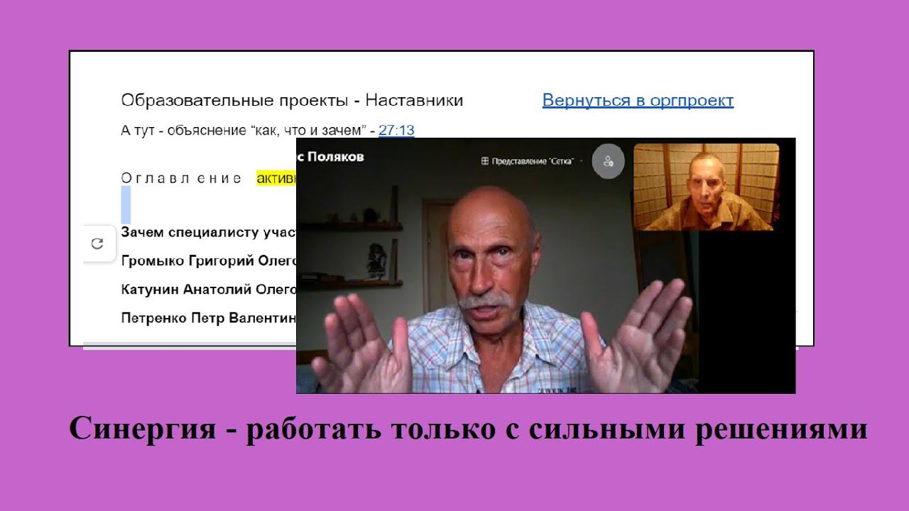 Мастер синергии - Б.А. Поляков приводит примеры синергии и квантовых скачков из своей практики. Предложение для всей орггруппы ШР-161 - встретиться и получить урок синергии и технологии развития - из рук Мастера. === Видео-книга "Прикладная синергия" - О г л а в л е н и е видео-книги, активное с прямыми ссылками на видео - https://docs.google.com/document/d/14NXgSwJ_uh5sTiRfiMLNnUJAi4t1Ev5hpkUGdr6vzHs/edit?usp=sharing Плэй-лист "Прикладная синергия" - https://youtube.com/playlist?list=PL949ECk7DvmT9j_ItogREdv1HXDgOUUuK Телеграм-группа "Театр Жизни" - https://t.me/theater_for_life === Шк. 161. Оглавление видео по проекту “Воспитание через взаимное обучение” https://docs.google.com/document/d/19ZHBAg_X0zcpDGH2Z5IT5h53eildzWA3Yxu5CbUqgaw/edit?usp=sharing Брэнд школы 161 - это не “молва о чём-то”. Брэнд - это “то самое”, о чём идёт молва. https://docs.google.com/document/d/1cTxtUtDNE2R-WmDrMyFVw-YzR7qGVUA2vQrtMTnYu1Y/edit?usp=sharing Плэй-лист "Воспитание через взаимообучение" - https://youtube.com/playlist?list=PLqeLVqJj13f-XjlKfUFzoQ3r898_rEEPJ === Фэйсбук-группа “Воспитание через взаимное обучение” - https://www.facebook.com/groups/skrad/ Фэйсбук-группа “Технология парного обучения” - https://www.facebook.com/groups/tehpaarobuch/ Связаться с Волкова Елена Васильевна можно так - https://www.facebook.com/profile.php?id=100024290378058 Связаться с Громыко Григорий Олегович можно так - Телеграм - GrigorijGromyko ВКонтакте - https://vk.com/id23067191 или Фэйсбук - https://www.facebook.com/grigorij.gro... === Е-учебник - каким он должен быть и как его делать - 19 минут - https://youtu.be/sMIjL5MQthk Общая схема работы с квантами знаний - 7 минут - https://youtu.be/7lQZtVgTR_E === Работа в парах, Технология парного обучения, Алгоритм работы в парах, ЭкоСеть, Школа Радости, Громыко Григорий Олегович, Навигатор образования