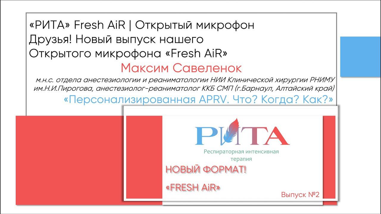 РИТА Fresh AiR | второй выпуск "Открытого микрофона" проекта "РИТА": младший научный сотрудник отдела анестезиологии и реаниматологии НИИ Клинической хирургии РНИМУ им.Н.И.Пирогова, анестезиолог-реаниматолог Краевой клинической больницы скорой медицинской помощи (г.Барнаул, Алтайский край) @Максим Савеленок о персонализированной APRV. Друзья, очень просим вас оставлять свои комментарии! Мы приглашаем вас поделиться своим опытом респираторной поддержки при COVID-19 в новой рубрике «Fresh AiR» в формате открытого микрофона , где каждый из вас может представить свой доклад, клинический случай или опыт в респираторной поддержке пациентов с COVID-19. Направляйте Ваши доклады продолжительностью до 10 минут нам на rita@emediq.ru и после рецензии научного руководителя Ваше сообщение будет опубликовано! Подписывайтесь на наш Telegram-канал "Телеграмма РИТЕ" - отвечаем на Ваши вопросы и проводим опросы по темам наших школ https://t.me/rita_resp Регистрируйтесь на образовательной платформе https://emediq.ru Ваши вопросы научному руководителю, а также предложения по проекту и тематикам направляйте на электронную почту rita@emediq.ru