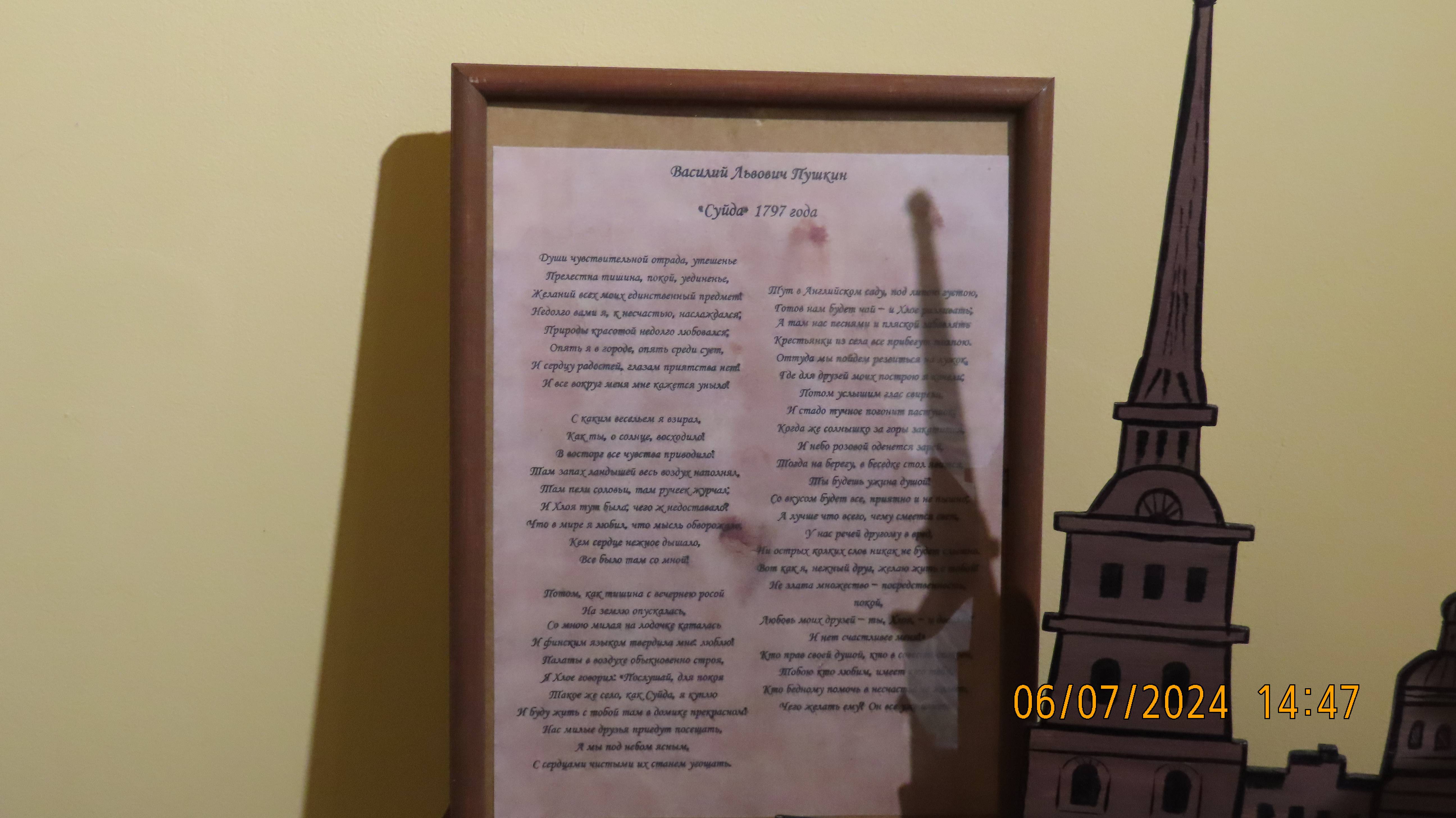 Музей-усадьба А.П. Ганнибала. Стихотворение В.Л. Пушкина "Суйда" Когда любовью я дышу, // Я лишь внимателен. Ей только надо // Продиктовать слова, и я пишу. (Данте) Пушкин Василий Львович. Суйда 1797  Души чувствительной отрада, утешенье  Прелестна тишина, покой, уединенье, Желаний всех моих единственный предмет! Недолго вами я, к несчастью, наслаждался; Природы красотой недолго любовался; Опять я в городе, опять среди сует, И сердцу радостей, глазам приятства нет! И все вокруг меня мне кажется уныло! С каким весельем я взирал, Как ты, о солнце, восходило! В восторг все чувства приводило! Там запах ландышей весь воздух наполнял, Там пели соловьи, там ручеек журчал; И Хлоя тут была; чего ж недоставало? Что в мире я любил, что мысль обворожало, Кем сердце нежное дышало, Все было там со мной! Потом, как тишина с вечернею росой На землю опускалась, Со мною милая на лодочке каталась И финским языком твердила мне: люблю! Палаты в воздухе обыкновенно строя, Я Хлое говорил: «Послушай, для покоя Такое же село, как Суйда, я куплю И буду жить с тобой там в домике прекрасном! Нас милые друзья приедут посещать, А мы под небом ясным, С сердцами чистыми их станем угощать. Тут в Английском саду, под липою густою, Готов нам будет чай – и Хлое разливать; А там нас песнями и пляской забавлять Крестьянки из села все прибегут толпою. Оттуда мы пойдем резвиться на лужок, Где для друзей моих построю я качели; Потом услышим глас свирели, И стадо тучное погонит пастушок. Когда же солнышко за горы закатится, И небо розовой оденется зарей, Тогда на берегу, в беседке стол явится, Ты будешь ужина душой! Со вкусом будет все, приятно и не пышно; А лучше что всего, чему смеется свет, У нас речей другому в вред, Ни острых колких слов никак не будет слышно. Поутру ж время с кем я буду провождать? С Гримфельдом и Руссо, с Боннетом и Томсоном; Их долг к полезному мой разум поощрять, И наставленья их я буду чтить законом, И вы, любезные, Юнг, Гесснер, Циммерман, Собой украсите мое уединенье. Кому любить добро дар милый небом дан, Тот в вас найдет всегда для сердца утешенье! Вот как я, нежный друг, желаю жить с тобой! Не злата множество – посредственность, покой, Любовь моих друзей – ты, Хлоя, – и доволен! И нет счастливее меня!» Кто прав своей душой, кто в совести спокоен, Тобою кто любим, имеет кто тебя, Кто бедному помочь в несчастье не жалеет, Чего желать ему? Он все уже имеет.
