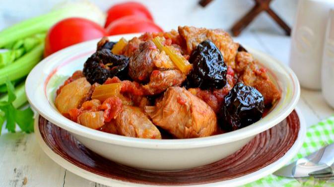 Мясо с сухофруктом. СВИНИНА, ТУШЕННАЯ С ЧЕРНОСЛИВОМ И СЕЛЬДЕРЕЕМ, В ТОМАТНО-ВИННОМ СОУСЕ