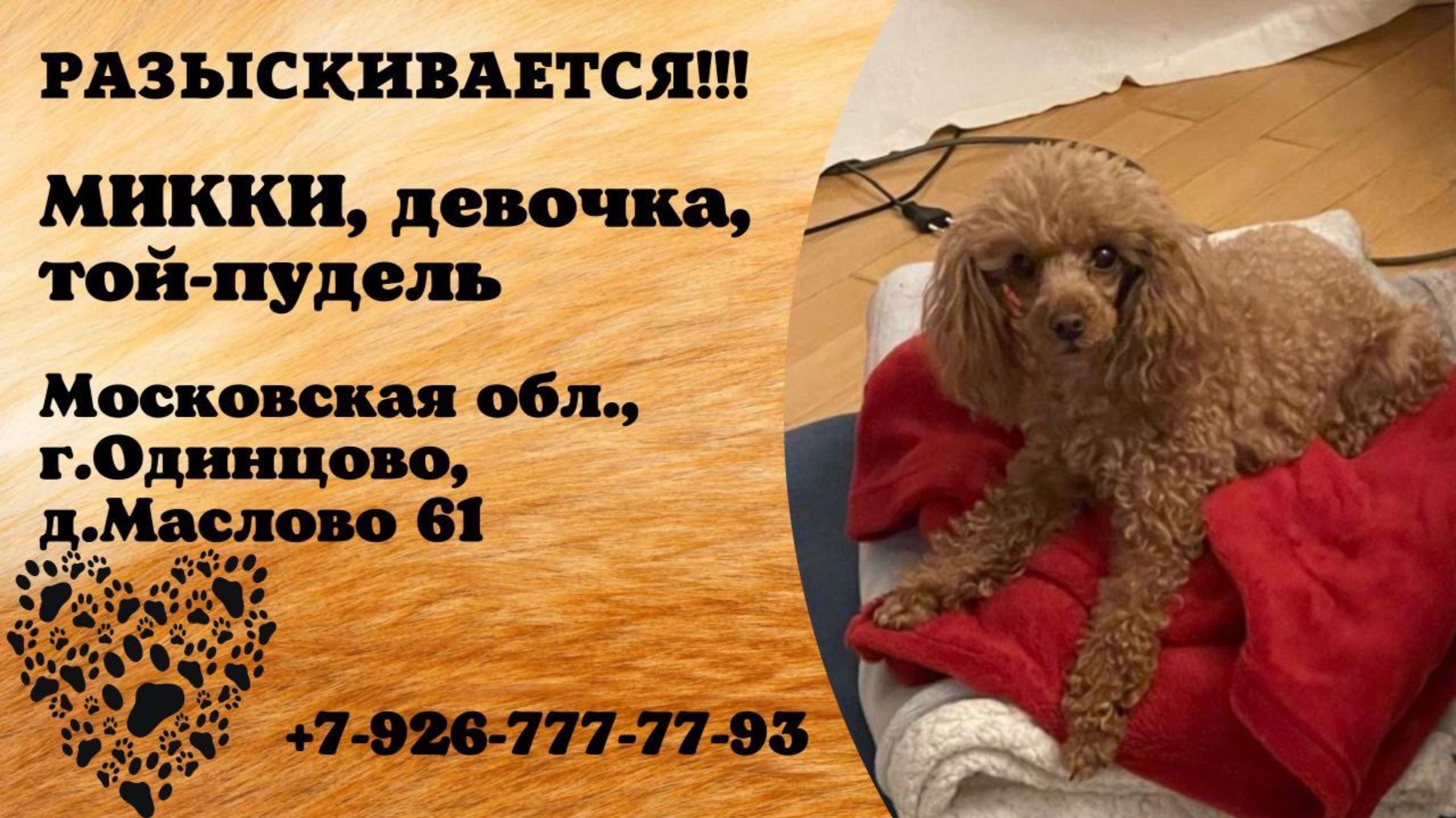 Московская Одинцово, д.Маслово Пропала собака Одинцовский р-н Пропала собака пудель Рыженькая девочка, очень маленькая, хрупкая, очень контактная Имя хозяина: Лия Телефон: 79267777793 Адрес: 46К-1032, Сосны Инфо: https://vk.com/wall-198815410_204270 #пропала_собака#московская#одинцово