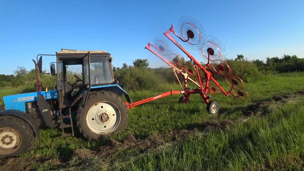переворачиваю сено после дождей и прессую свеже кошенную