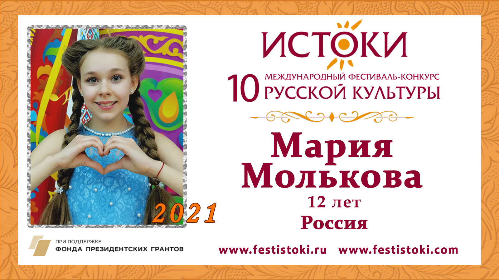 Финалист Юбилейного X Международного фестиваля-конкурса русской культуры "Истоки". Сайт: www.festistoki.ru / www.festistoki.com E-mail: festistoki@mail.ru