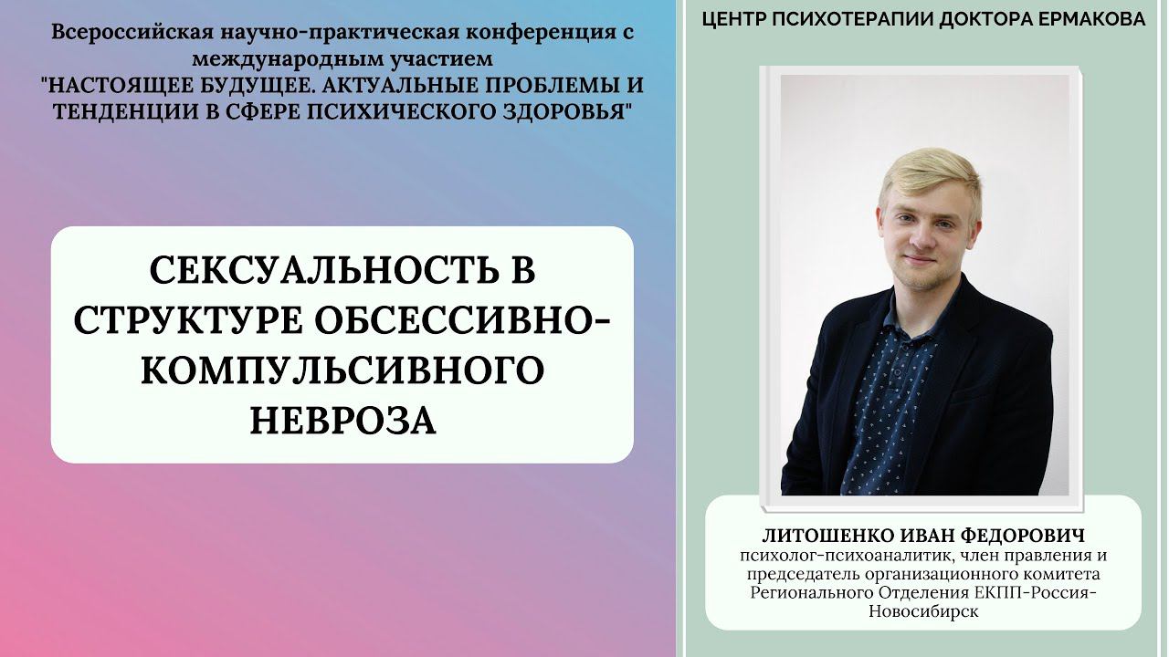 Всероссийский форум специалистов помогающих профессий с международным участием "НАСТОЯЩЕЕ БУДУЩЕЕ. АКТУАЛЬНЫЕ ПРОБЛЕМЫ И ТЕНДЕНЦИИ В СФЕРЕ ПСИХИЧЕСКОГО ЗДОРОВЬЯ" СЕКСУАЛЬНОСТЬ В СТРУКТУРЕ ОБСЕССИВНО-КОМПУЛЬСИВНОГО НЕВРОЗА Литошенко Иван Фёдорович - психолог-психоаналитик Центра психотерапии доктора Ермакова, член правления и председатель организационного комитета Регионального Отделения ЕКПП-Россия-Новосибирск. Россия, Новосибирск. В докладе будет рассмотрена роль и значение сексуальности в том числе инфантильной, исходя из психоаналитического подхода. Рассматриваются различные школы психоанализа и обобщаются взгляды разных школ на сексуальность и обсессивно-компульсивный невроз.