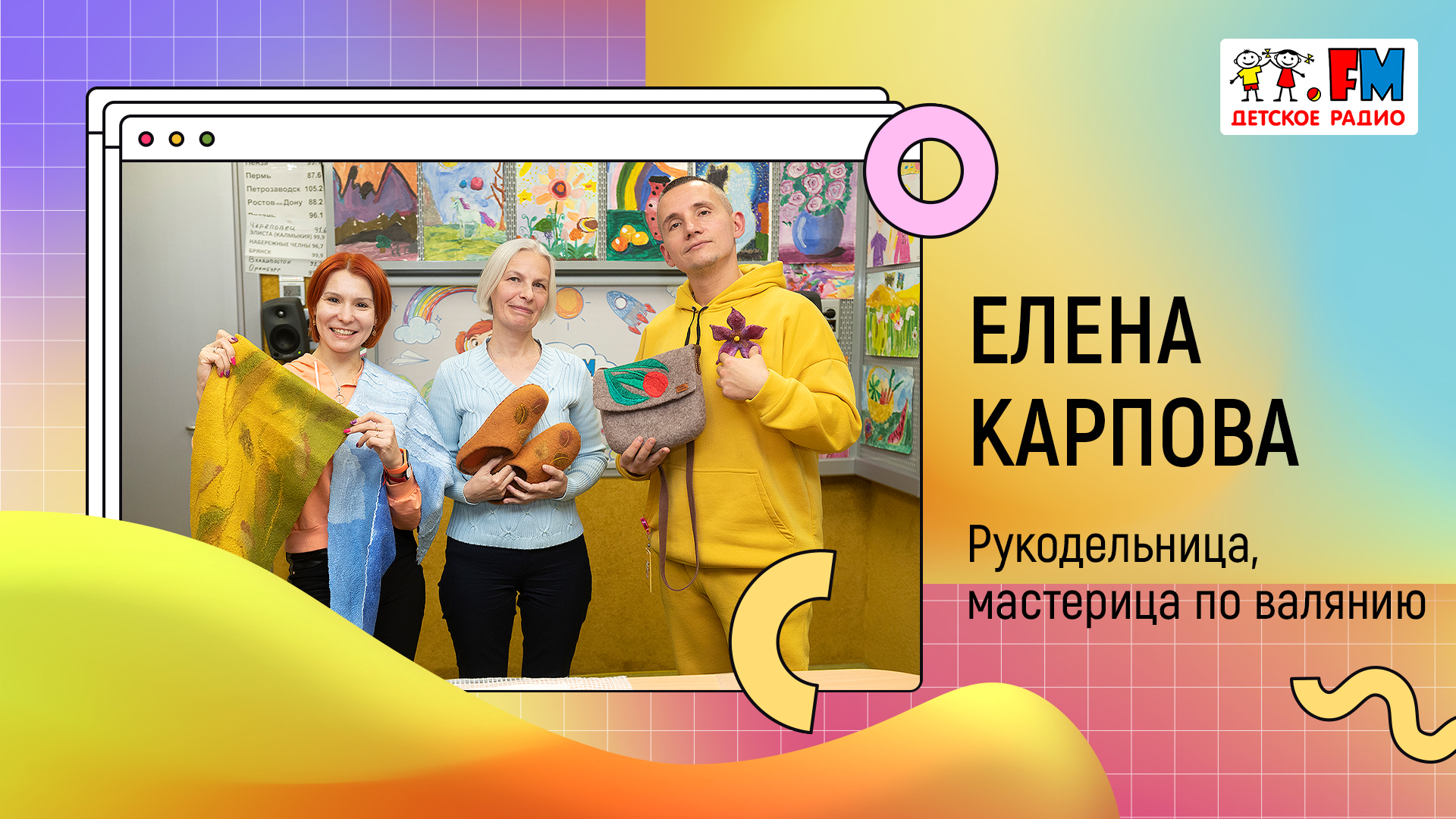 В студии Детского радио рукодельница, мастерица по валянию - Елена Карпова. Она расскажет: - как давно начала валять, с чего всё началос и какая была первая работа? - чем мокрое валяние отличается от сухого? - какие материалы нужны для мокрого валяния? - как свалять цветочек? - можно ли свалять любую одежду? - какая работа была самая долгая по времени? - какая работа была самая необычная? - правда ли, что валяние – это занятие, которое расслабляет? - нужна ли выкройка для валяния?
