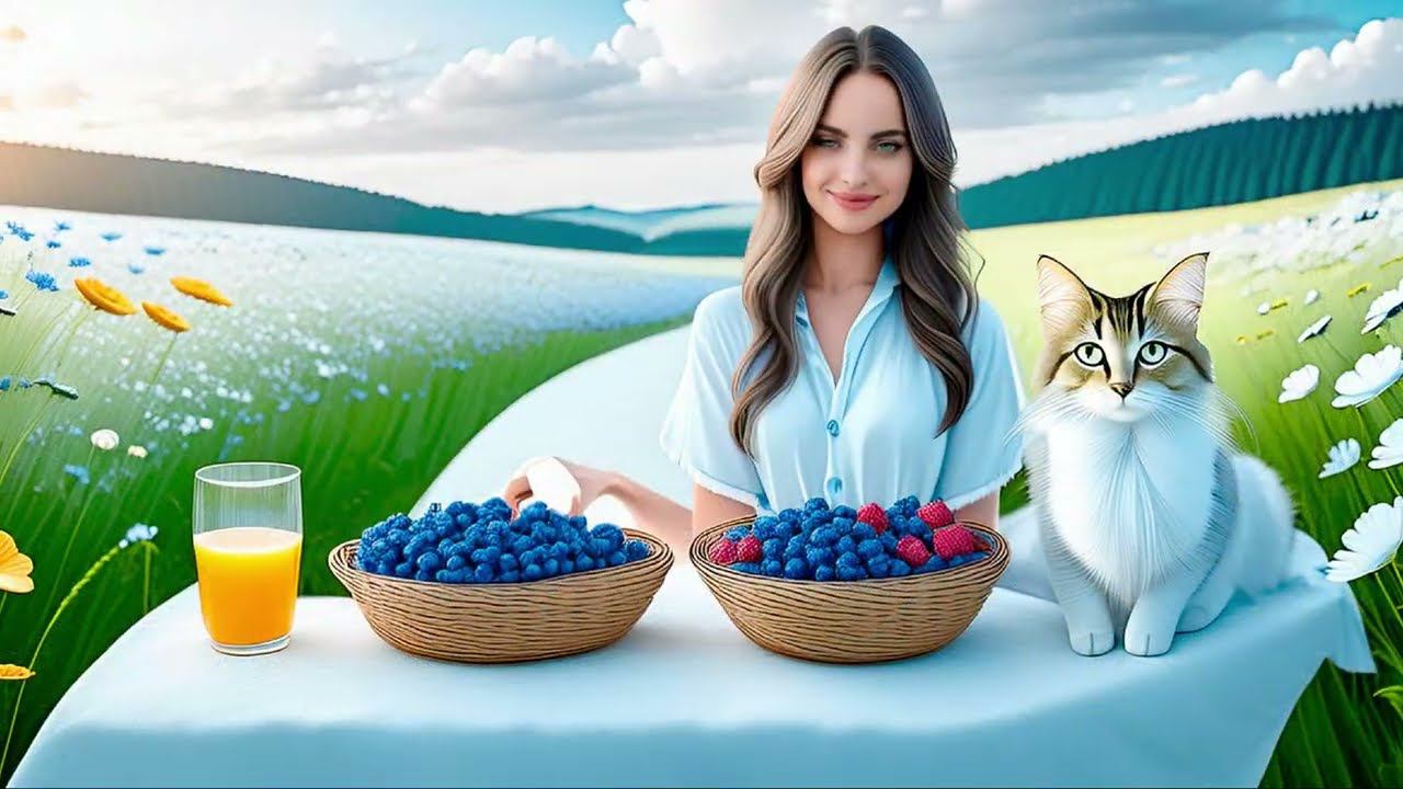 Праздник на поляне среди волшебных цветов: маков, васильков, ромашек; с фантастическим котом; с волшебной скатертью самобранкой с ягодной и фруктовой закуской: огромной клубникой, ежевикой, персиками; со свежевыжатым соком, заколдованной округлой формы банкой маринованных помидор и огурцов. A feast in a glade among magical flowers: poppies, cornflowers, daisies; with a fantastic cat; with a magic tablecloth with a berry and fruit snack: huge strawberries, blackberries, peaches; with freshly squeezed juice, enchanted round-shaped jar of pickled tomatoes and cucumbers. cat ghost, maiden spirit, spirit meadow, magic, magic glade