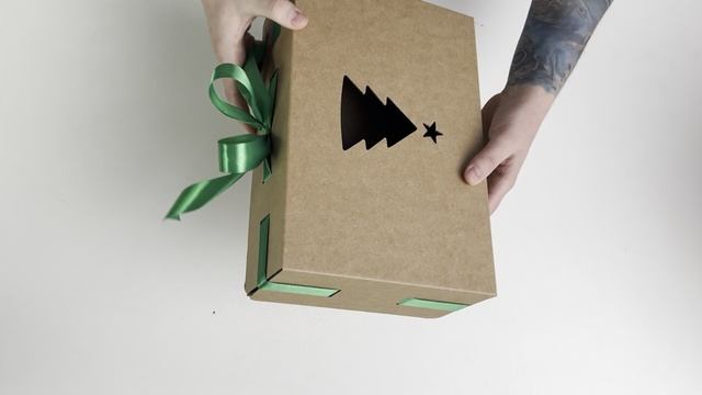 Новогодняя коробка Gofromir - 300х200х100 бурая с зеленой лентой (с вырезом "елка")