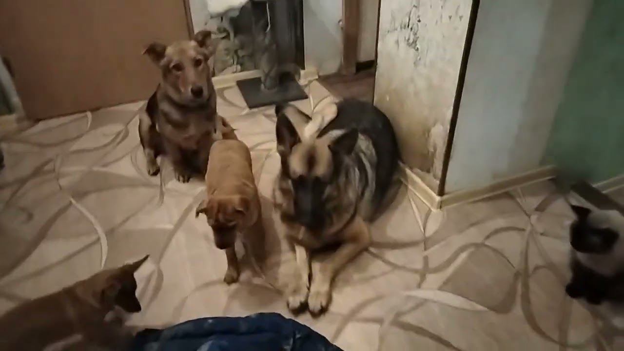 Щенки помогают волонтеру помыть полы