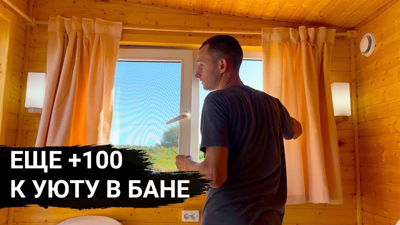 Мы хотели льняные шторы, а получились персиковые, сделал вечернюю подсветку в бане у пруда