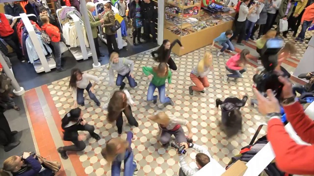 Энергичный танцевальный флешмоб Red Fox открытый оборудование во время открытия магазина "Планета Спорт"