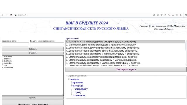 (10.6) ШИХИЕВА Лейла Фуадовна Республика Дагестан, г. Махачкала МБОУ «Многопрофильная гимназия № 38», 11 класс СИНТАКСИЧЕСКАЯ СЕТЬ РУССКОГО ЯЗЫКА Научный руководитель: Шихиева Фарида Пашаевна, Республика Дагестан, г. Махачкала, МБОУ «Многопрофильная гимназия № 38», учитель информатики Более подробно о мероприятиях Программы "Шаг в будущее" можно узнать на сайтах http://www.step-into-the-future.ru/ и http://шагвбудущее.рф