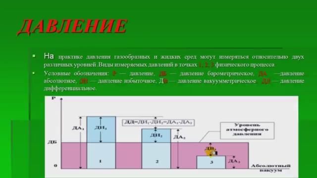 В видео показаны все виды давления и как их отличать друг от друга. Ключевые слова: давление, единицы измерения давления, абсолютное давление, избыточное давление, вакуум Ключевые слова: абсолютное давление, избыточное давление, вакуум, единицы измерения давления, давление,