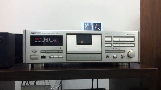 Pioneer T-1000S ¥100,000(1991年発売) ドルビーSとFLAT SYSTEMを搭載したステレオカセットデッキ。 業務用ドルビーSRをベースに一般用にリファインされたドルビーSを搭載しており、優れたノイズ低減効果を実現しています。 ドルビーSの特徴は、「動作置換」や「変調制御」と呼ばれる技術によって、音楽信号のレベルや帯域に応じて常に適正・最小の動作で最大が得られることで、特に高域では適正回路が処理する動作置換で、他の信号成分に影響を与える事の無い効果的な処理が行われています。 また、誤動作を招く入力信号の超高域、超低域成分は、スペクトラル・スキューイング回路が、不要な圧縮増加を抑えており、さらに高域と低域に採用されたアンチ・サチュレーション回路が信号補正を行い、テープの能力ぎりぎりの録音を可能にしています。 ドルビーSではもう一つの特徴として「変調制御」があり、ノイズリダクション回路部出力を、フィルターを経由して信号処理部の制御系にフィードバックして圧縮低下を防止する事が可能となっています。 これらの結果、極めて効率の高いノイズリダクション効果を実現しており、さらに改善効果が大きいほど相反して気になりがちだったブリージングノイズ(背後で不安定に雑音が変動する息つぎ現象)を押さえ込むことに成功しています。 パイオニア独自のFLAT SYSTEMを搭載しており、バイアス・感度・イコライザーの調整を行い、より高精度に周波数特性をフラット化しています。 FLAT SYSTEMの補正ポジションは、低域(400Hz)・中高域(3kHz)・超高域(15kHz)の3ポイントで、データ分析をバイアス64ステップ、レベル32ステップ、イコライザーは中高域16ステップ、超高域3ステップの分解能を有するマイコンが行い、テープにそれぞれ適正な数値を高精度かつ短時間で自動調整します。 また、バイアス調整はアップ・ダウンボタンにより、オートチューニング後にさらにマニュアル微調整が可能です。 デッキ主要スイッチポジションおよびFLAT SYSTEMのデータを記憶するラストメモリー機能を搭載しています。 FLAT SYSTEMで得たB.L.E(バイアス、感度、イコライザー)およびマニュアルで可変したバイアスなどのデータと、ラインストレート、ドルビーHX PRO、ドルビーノイズリダクション、メーターレンジ、ディスプレイオフなどの、ON/OFFのスイッチ位置、さらに電子カウンターの数字を電源OFFの状態でもメモリーしており、タイマー録音時にもFLAT SYSTEMを活用した録再が可能となっています。 徹底した高剛性構造による無振動・無共振化と、信号経路の最短化を満たすため、ミッドシップマウント・デザインを採用しています。これにより、内部構造を2枚のインナーシャーシによって3分割することにより、剛性を飛躍的に向上しており、しかも再生、録音、制御及びバイアス発振器の各回路を電気的に分離して、信号間の干渉を排除したレイアウトを実現しています。特にオーディオ信号のノイズ源となるFLディスプレイや制御回路、バイアス発振回路を左側に独立してレイアウトしています。 また、ミッドシップマウントによるNewダイレクトコンストラクションにより、ヘッド部を中央に配置したことにより、録音から再生に至る信号経路のシンプル化および最短化を図っています。 メカニズムにはZメカをより磨き上げて開発されたNewスラントZメカニズムを搭載しています。 テープトランスポート部全体を10゜傾斜させた設計となっており、これによってキャプスタン軸受けにかかる負荷が軽減され、軸ブレも低減し、回転を安定させています。また、膨大な実験と試聴を繰返して10度という角度を決定しており、これによってテープ片面だけに荷重がかかる問題を克服し、バランスが良くスムーズな走行性を獲得しています。 さらに巻取り側のキャプスタン軸受けには新素材FG(Fine Grain)メタルを採用しており、従来のオイルレスメタルを新製法によってポーラス(オイルを蓄える空孔)の分布を均一化することで、表面粗度を向上し、軸受けロスを約10%改善し、走行特性を高めてます。 また、ヘッドブロックには亜鉛ダイキャストの二重構造を採用しており、ヘッドタッチ精度を確保するとともに外部の微振動を排除しています。 またキャプスタンシャフトは、FS処理を施す事でテープスリップを防ぎ安定した走行を可能にしています。 テープの巻取りトルクをマイコンでコントロールするデジタルテンションコントロールを搭載しています。 巻き径の大きさに応じてマイコンがリールモーター電圧をコントロールしながら、適正なテープテンションで巻取りを行い、不安定になりがちだったテープの巻き始めのワウ・フラッターを改善します。 録再ヘッドには、優れた電磁変換特性を持つレーザーアモルファスヘッドを搭載しており、さらにコイル巻線にはPC-OCC(単結晶状高純度無酸素銅)を採用し、微小信号レベルの伝送損失を排除しています。 消去ヘッドには、消去周波数を210kHzにシフトした新