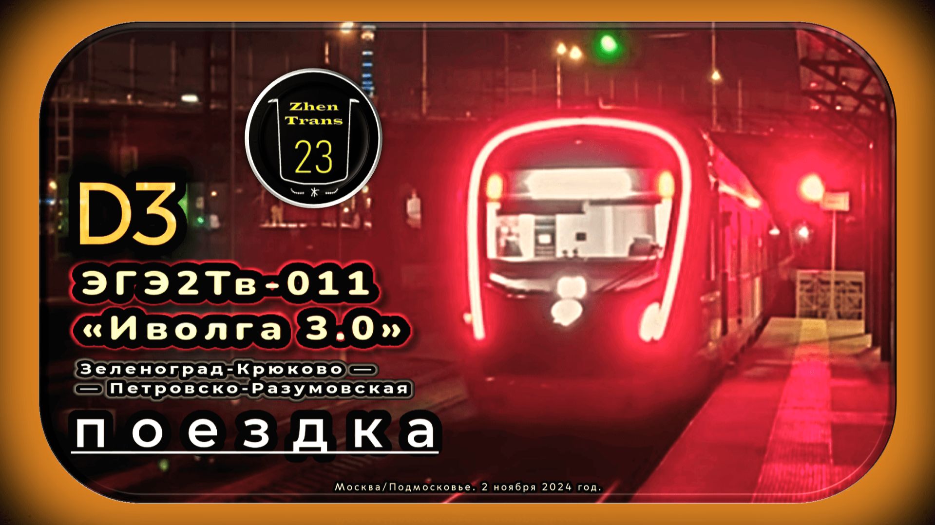 В этом видео я показал ночную ноябрьскую поездку на электропоезде модели ЭГЭ2Тв-011 «Иволга 3.0» по Ленинградскому направлению линии третьего Московского Центрального Диаметра (D3) от «Зеленоград-Крюково» до «Петровско-Разумовской». Снято 2 ноября 2024 года. Поддержка моего канала - 2202 2023 6913 7413. Тайм-коды к видео: 00:00 – Начало. 00:25 – Станция «Зеленоград-Крюково» Ленинградского направления Октябрьской железной дороги D3. Подготовка к отправлению на Ипподром электропоезда ЭГЭ2Тв-011 «Иволга 3.0». 00:56 – Зеленоград-Крюково — Фирсановская (без остановки на платформе «Малино»). 09:58 – Фирсановская — Сходня. 14:00 – Сходня — Подрезково. 18:45 – Подрезково — Новоподрезково. 21:12 – Новоподрезково — Молжаниново. 24:27 – Молжаниново — Химки. 31:37 – Химки — Левобережная. 33:42 – Левобережная — Ховрино. 36:18 – Ховрино — Грачёвская. 39:24 – Грачёвская — Моссельмаш. 41:45 – Моссельмаш — Лихоборы. 44:15 – Лихоборы — Петровско-Разумовская. 46:34 – Платформа «Петровско-Разумовская». Отправление на Ипподром электропоезда ЭГЭ2Тв-011 «Иволга 3.0». 47:30 – Концовка. VK страница: https://vk.com/evgeniynaumov23 Telegram-канал: https://t.me/ZhenTrans23 Telegram-группа: https://t.me/zhentrans23chat Дзен: https://dzen.ru/zhentrans23 RUTUBE: https://rutube.ru/channel/23921395/ YouTube: https://www.youtube.com/@zhentrans23/videos