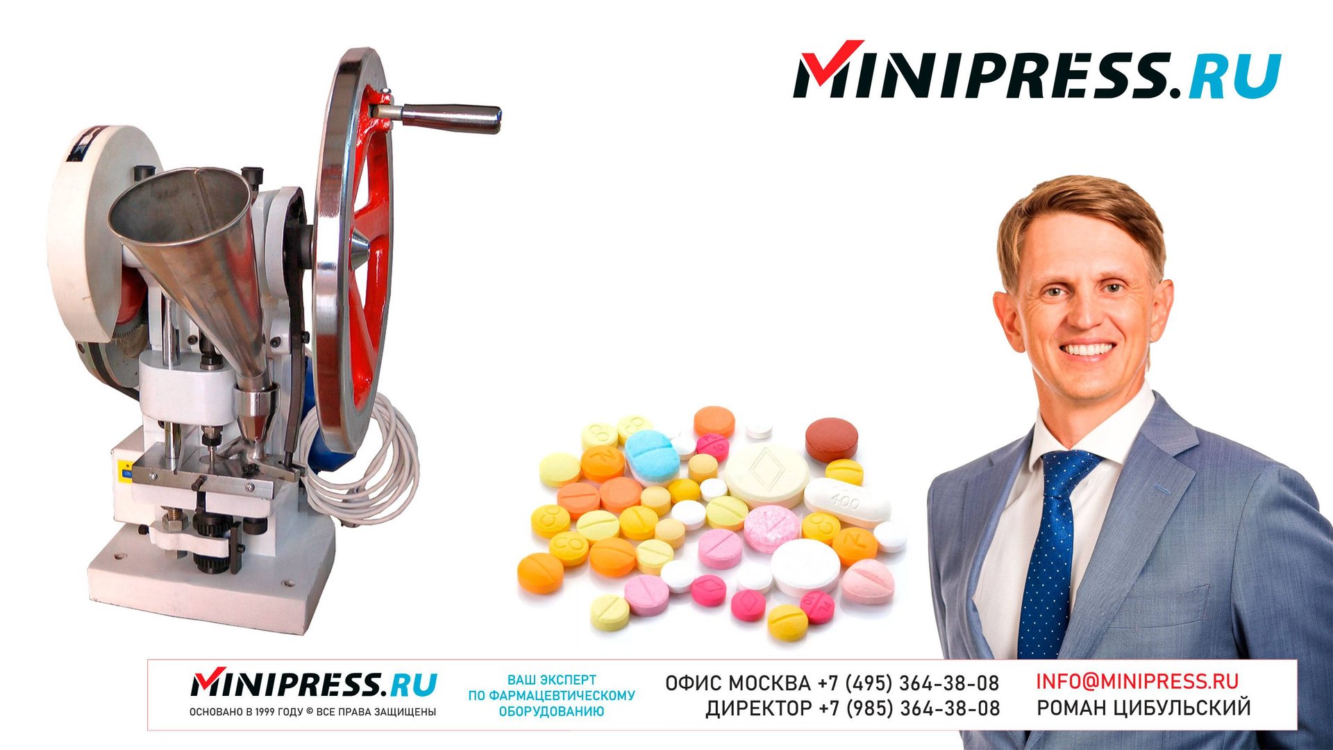 Таблеточный пресс 6000S https://Minipress.ru/katalog/ Фармацевтическое оборудование. Специалисты в фармацевтическом оборудовании и технологиях производства лекарств. Более 20 лет оказываем нашим клиентам помощь в выборе, поставке, наладке различного фармацевтического оборудования! Вы в поиске надежного поставщика оборудования? Мы предоставим вам лучший сервис 24/7. Собрана лучшая команда профессионалов в фармацевтической отрасли и налажены стабильные связи с лучшими производителями. Мы не только продаем, но и производим многие модели оборудования Директор компании Минипресс Роман Цибульский Поставка фармацевтического оборудования в Россию Пишите: info@minipress.ru Телефон +7(495)364-38-08; Мобильный +375(29)308-00-00 Россия, Москва Skype: RomanTsibulsky; ICQ: 310-134-490 Подписывайтесь на наш видео канал на Youtube https://youtube.com/user/wwwMinipressru Обновленный сайт https://Minipress.ru Каталог оборудования https://Minipress.ru/katalog/ МЫ В СОЦИАЛЬНЫХ СЕТЯХ G+ https://plus.google.com/+RomanTsibulsky/ FB https://facebook.com/roman.tsibulsky YOUTUBE https://youtube.com/user/wwwMinipressru IN https://ru.linkedin.com/pub/roman-tsibulsky/a6/933/661 БОЛЬШОЙ КАТАЛОГ ФАРМАЦЕВТИЧЕСКОГО ОБОРУДОВАНИЯ https://minipress.ru/katalog/ Постоянно обновляемый каталог различного фармацевтического оборудования с фотографиями, описаниями, видео и ценами. ПЕРСОНАЛЬНЫЙ МЕНЕДЖЕР 24 ЧАСА https://minipress.ru/katalog/ Вы общаетесь по всем вопросам, с момента первой консультации и до получения оборудования, с одним специалистом. СПЕЦИАЛИСТЫ И ТЕХНОЛОГИ https://minipress.ru/katalog/ Имеем обширные связи в фармацевтической среде, найдем любого специалиста, поможем с освоением оборудования и технологий. ОБСУЖДЕНИЕ ВАШИХ ИДЕЙ ПО ПРОИЗВОДСТВУ ПРОДУКЦИИ https://minipress.ru/katalog/ Поможем в оценке ваших идей. Большой опыт в организации различных производств и выпуске продукции. Ценные советы. ФАРМАЦЕВТИЧЕСКОЕ ОБОРУДОВАНИЕ Мы поставили перед собой задачу, помогать нашим клиентам в правильном выборе фармацевтического оборудования. Многолетний опыт подобной деятельности показывает, что многие клиенты сталкиваются, в первую очередь, с непониманием технологического процесса. Покупка оборудования должна быть финальной точкой после подробного обсуждения задачи, консультацией с производителем оборудования, отправкой сырья и материалов на фабрику, тестирования в работе. ДЛЯ ТАБЛЕТОК https://minipress.ru/katalog/category/farmacevticheskoe_oborudovanie/ Смешивание порошков, гранулирование, прессование, обеспыливание, покрытие оболочками, фасовка, упаковка, счет, нанесение логотипов ДЛЯ ЖЕЛАТИНОВЫХ КАПСУЛ https://minipress.ru/katalog/category/farmacevticheskoe_oborudovanie/kapsulyatory-dlya-tverdyh-zhelatinovyh-kapsul/ Фасовка порошков и масел, обеспыливание, счет и фасовка, упаковка, нанесение логотипов. ФАСОВКА И УПАКОВКА https://minipress.ru/katalog/category/upakovochnoe_oborudovanie/ Упаковка в пластиковые и стеклянные флаконы, блистер, фольгу, ламинированную бумагу, стеклянные ампулы, саше, стрипы, тубы, тюбики, контурную ячейку. ТЕХНОЛОГИЧЕСКОЕ https://minipress.ru/katalog/category/eksperimentalnoe-oborudovanie/ Лабораторное, аналитическое, подготовительное, отдельные машины и линии под ключ. СФЕРЫ ДЕЯТЕЛЬНОСТИ Наша компания занимается множеством направлений фармацевтического бизнеса! Предлагаем Вам посетить страницы нашего сайта https://www.Minipress.ru по различным специализациям. ОБОРУДОВАНИЕ ДЛЯ НАКЛЕЙКИ ЭТИКЕТОК НА БУТЫЛКИ АМПУЛЫ ФЛАКОНЫ https://minipress.ru/katalog/oborudovanie-s-otzyvami/oborudovanie-dlya-naklejki-etiketok-na-butylki-ampuly-flakony/ Автоматическое этикетировочное оборудование для этикеток на клеевой основе БЛИСТЕРНЫЕ МАШИНЫ ДЛЯ УПАКО