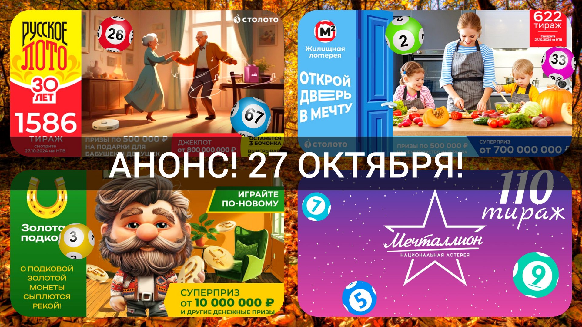 АНОНС на 27 октября.РУССКОЕ ЛОТО 1586 тираж| ЖИЛИЩНАЯ лотерея 622 тираж| ЗОЛОТАЯ ПОДКОВА 478 тираж.