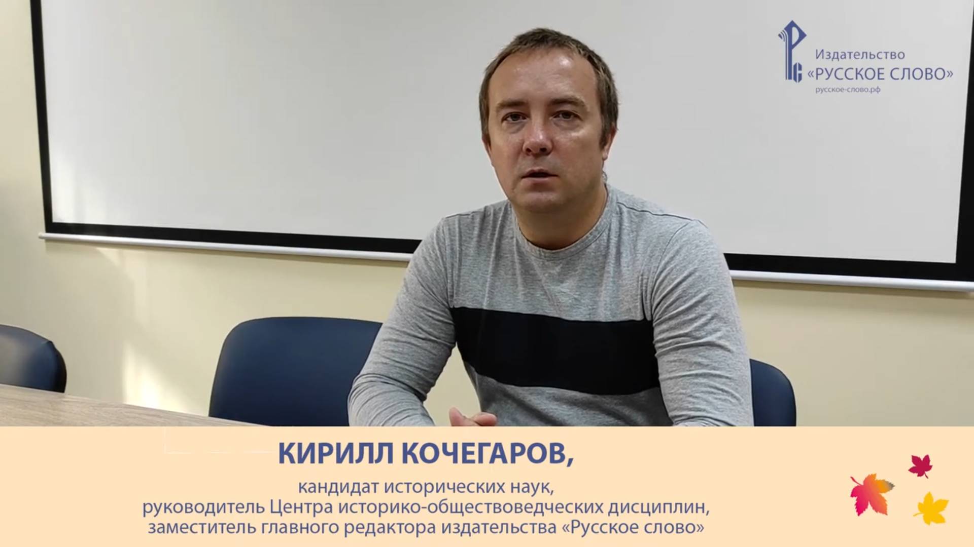 Кирилл Кочегаров поздравляет с Днём учителя. 2020 Кочегаров Кирилл Александрович, кандидат исторических наук, автор более двадцати научных статей и монографии, удостоенной медали РАН с премией для молодых ученых (2009), руководитель центра историко-обществоведческих дисциплин. https://русское-слово.рф/ Присоединяйтесь к нам в социальных сетях! Телеграм: https://t.me/rslovo ВКонтакте: https://vk.com/rus_slo Одноклассники: https://ok.ru/group/57720246435859 #Русское_слово, #Вебинары_РС #Деньучителя