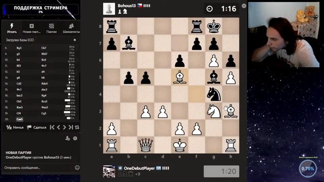 Друзья, всем привет. Партия со стрима, представляю вашему вниманию. Шахматы. Блиц 3+0 на chess.com. Если интересно, - подписывайтесь на канал, ставьте лайки, оставляйте комментарии. Поддержка через: DonationAlerts: https://www.donationalerts.com/r/onedebutplayer Бусти: https://boosty.to/onedebutplayer/donate Donatepay: https://new.donatepay.ru/@1272445