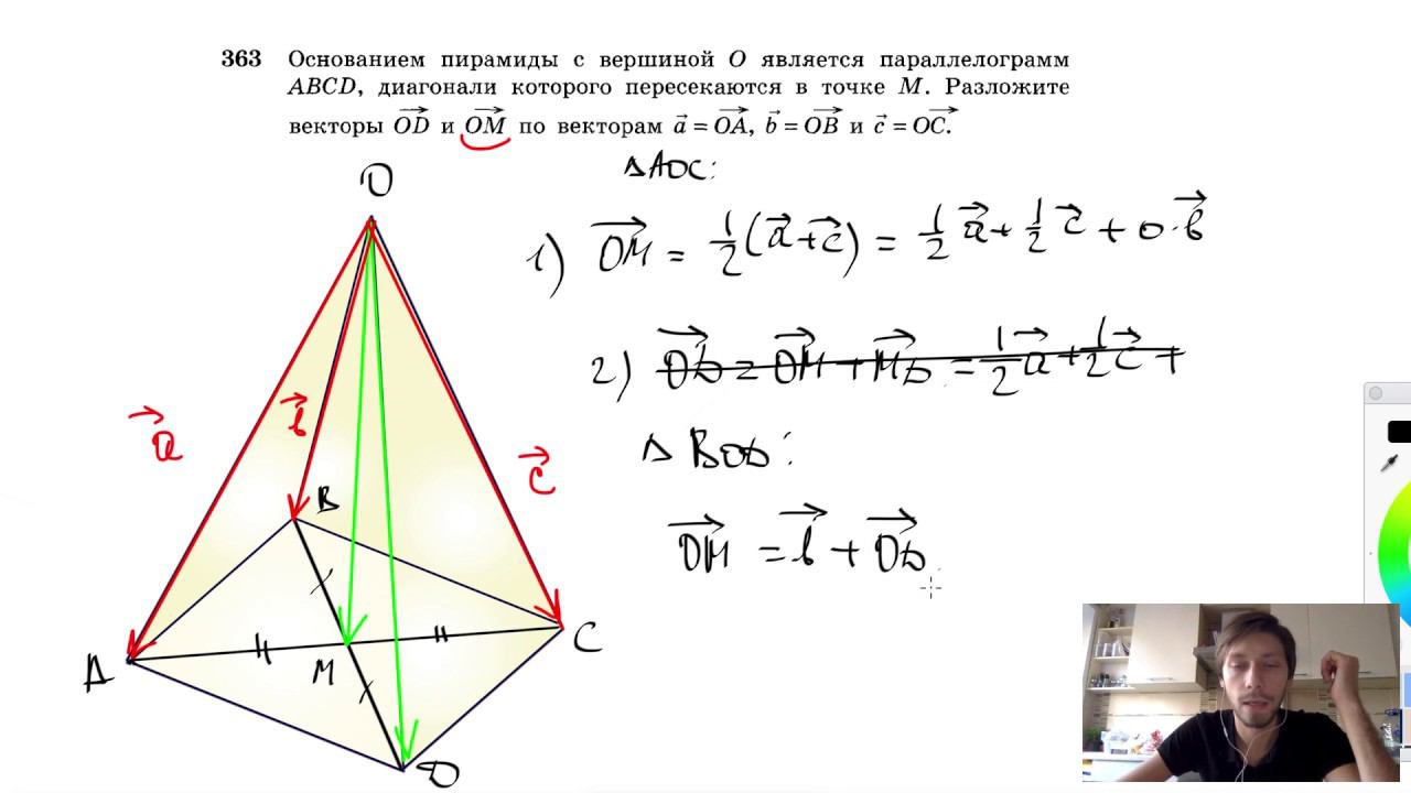 №363. Основанием пирамиды с вершиной О является параллелограмм ABCD, диагонали которого пересекаются в точке M. Разложите векторы OD и ОМ по векторам a = OA, b = OB и c = OC. Поддержать канал рублём - 5469400944002125 (Сбербанк) Мой второй канал для подготовки к ЕГЭ и ОГЭ - https://www.youtube.com/ЕвгенийСумин Инстаграм - https://www.instagram.com/EGE_OGE.math Личный инстаграм - https://www.instagram.com/ee_sumin VK - https://vk.com/evgeniysumin FB - https://www.facebook.com/EvgeniySumin