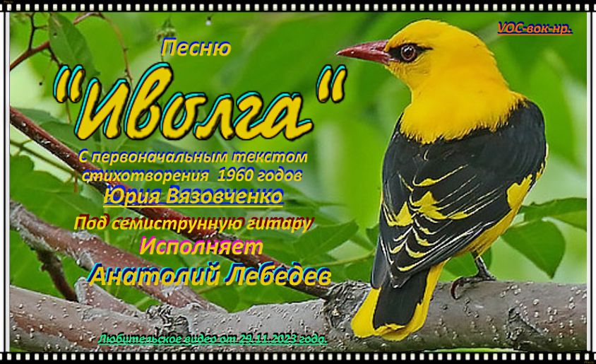 Лебедев из Питера. ЛЮБИЕТЕЛЬСКОЕ ВИДЕО Анатолия Лебедева с его исполнением песни "ИВОЛГА". Здесь А. Лебедевым представлена песня с первоначалным,авторским текстом поэта-любителя ЮРИЯ ВЯЗОВЧЕНКО 1960-тых годов. Но со слов поэта АЛЕКСАНДРА ПОГОРЕЛКИНА, он в 1969 году в одном из сборников стихов увидел стихотворение Ю.Вязовченко и написал на него свою переделку, а так же сочинил мелодию. Так родилась песня "ИВОЛГА", известная и ныне,Особенно она популярна в исполнении Евгения Осина. Видеозапись исполнения песни и монтаж видеоролик А. Лебедева от 29 ноября 2023 года.