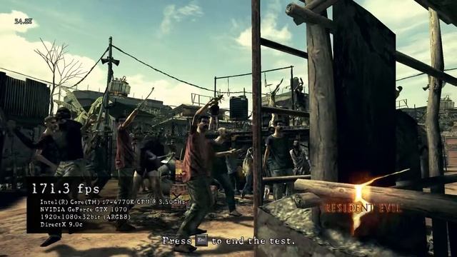 Resident Evil 5 Benchmark - Medium Quality. 1920x1080. Average FPS: 176.5 Note that about 10% performance is lost by capturing game footage using OBS Studio. Benchmark run on Intel i7 4770K @ stock settings 16GB (2x8GB) G.SKILL Ripjaws X DDR3-2133MHz ASUS GTX 1070 1633c/2002m on Geforce 373.06 driver Windows 10 x64