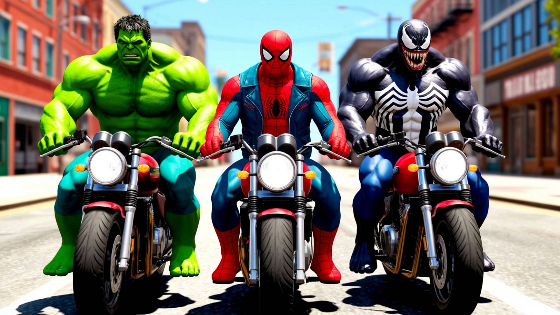 Мультики для малышей. Супер герои проходят трассу с препятствиями на мотоциклах.