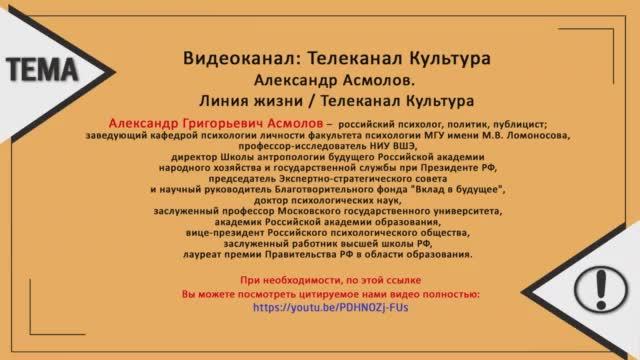 Сложно признаться в своем незнании, особенно сделать это публично, да еще и на федеральном канале. Но для научной честности это обязательное условие. В данном видео представлена попытка выделить суть, убрав эмоции и отвлечения. Насколько это получилось и какое будущее нас ждет, Вы можете узнать на видео Александр Григорьевич Асмолов — российский психолог, политик, публицист; заведующий кафедрой психологии личности факультета психологии МГУ имени М.В. Ломоносова Полная версия видео доступна по ссылке: https://www.youtube.com/watch?v=PDHNOZj-FUs Дополнительные материалы: Психология творчества https://vikent.ru/enc-list/category/229/ Постановка проблемы «В чём смысл жизни?» с помощью понятия «переход к надсистеме» https://vikent.ru/enc/451/ #будущее #прогноз #психология #психолог #смысл #рема #видеокейс