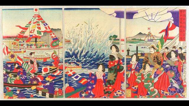Tokyo Metropolitan Symphony Orchestra conducted by Takuo Yuasa. Yumiko Mizoiri (hichiriki) The Symphony 'Inno Meiji' had its première in Tokyo on 1 May 1921, with the composer himself conducting a provisionally assembled orchestra. The work was often performed in Japan until World War II, as well as in Berlin, London and Moscow, as one of Yamada's masterpieces. There exist 78 rpm recordings of Yamada conducting the Berlin Philharmonic. This single-movement epic work depicts Japanese history from the 1850s, when Japan was in confusion as to whether to open the country or to remain in isolation, to the early twentieth century, when the country was drastically westernised. It is a symphonic poem rather than a symphony, although it evokes the first or the last movement of the traditional symphony, in that it is in sonata form, where two themes expressing Japanese civilisation and Western civilisation respectively, conflict and harmonize. 'Meiji' of the title denotes the Meiji Period (1868-1912), during which Emperor Meiji ruled over Japan. For Yamada, who was one of the most important composers in Japan and who adored Richard Strauss, the great composer of symphonic poems, it was an inevitable task to depict Japanese history in orchestral music. The instrumentation consists of triple winds with additional percussion, including hichiriki and other Asian instruments. Picture: "Illustration of an Explosion from a Torpedo in the Sumida River During a Festival with Boat Races" (1881) by the Japanese artist Toyohara Chikanobu. Sources from the booklet of the recording: https://www.naxos.com/mainsite/blurbs_reviews.asp?item_code=8.557971&catNum=557971&filetype=About%20this%20Recording&language=Englis #