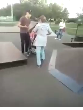 Женщина с ребенком выражает недовольство ребятам на спортплощадке.