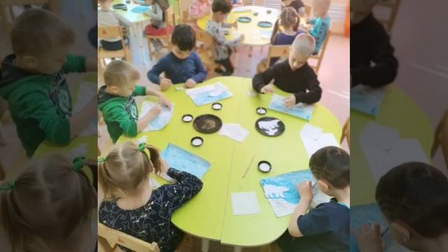 276 В группе " Золотая рыбка" прошло аппликация +рисование на тему " Медведи на льдине " Цель :Закрепление знаний детей о животных севера ( белого медведя ), внешнем виде, образе жизни в природе;Учить детей выполнять объёмное изображение с помощью салфеток, расширять знания детей о белом медведе; Развивать умение работать с шаблоном, клеем, салфетками ;Развивать пространственное мышление и воображение, развивать чувство формы и композицию