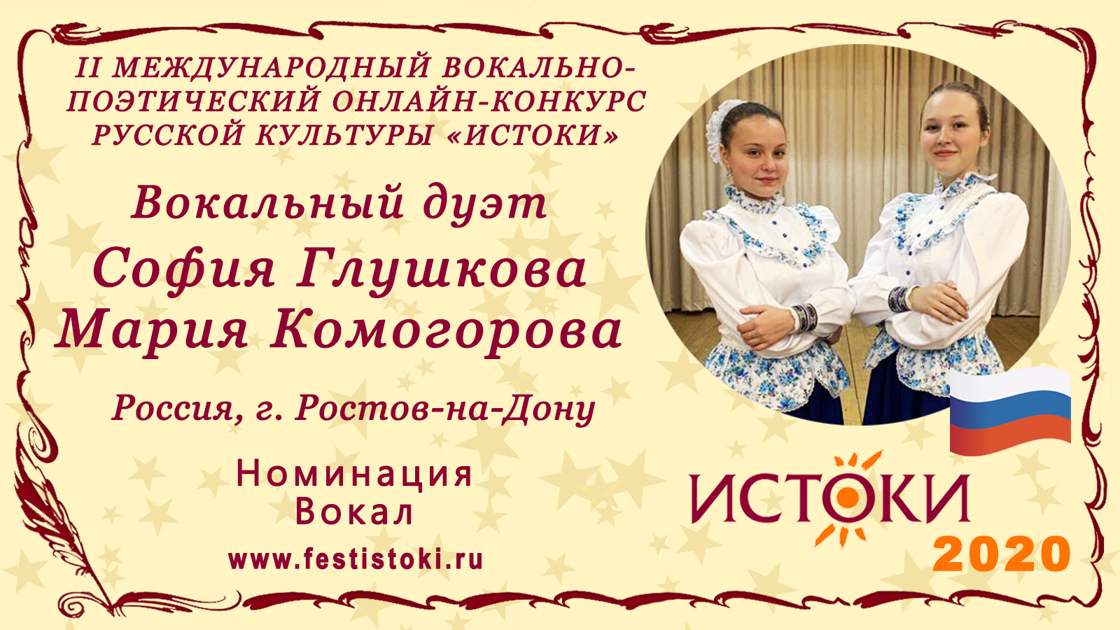 Лауреаты I степени II Международного вокально-поэтического онлайн-конкурса русской культуры «Истоки». Номинация - Вокал. Песня "Казачка вольная". Музыка и слова Анны Сизовой. Сайт: www.festistoki.ru / www.festistoki.com E-mail: festistoki@mail.ru