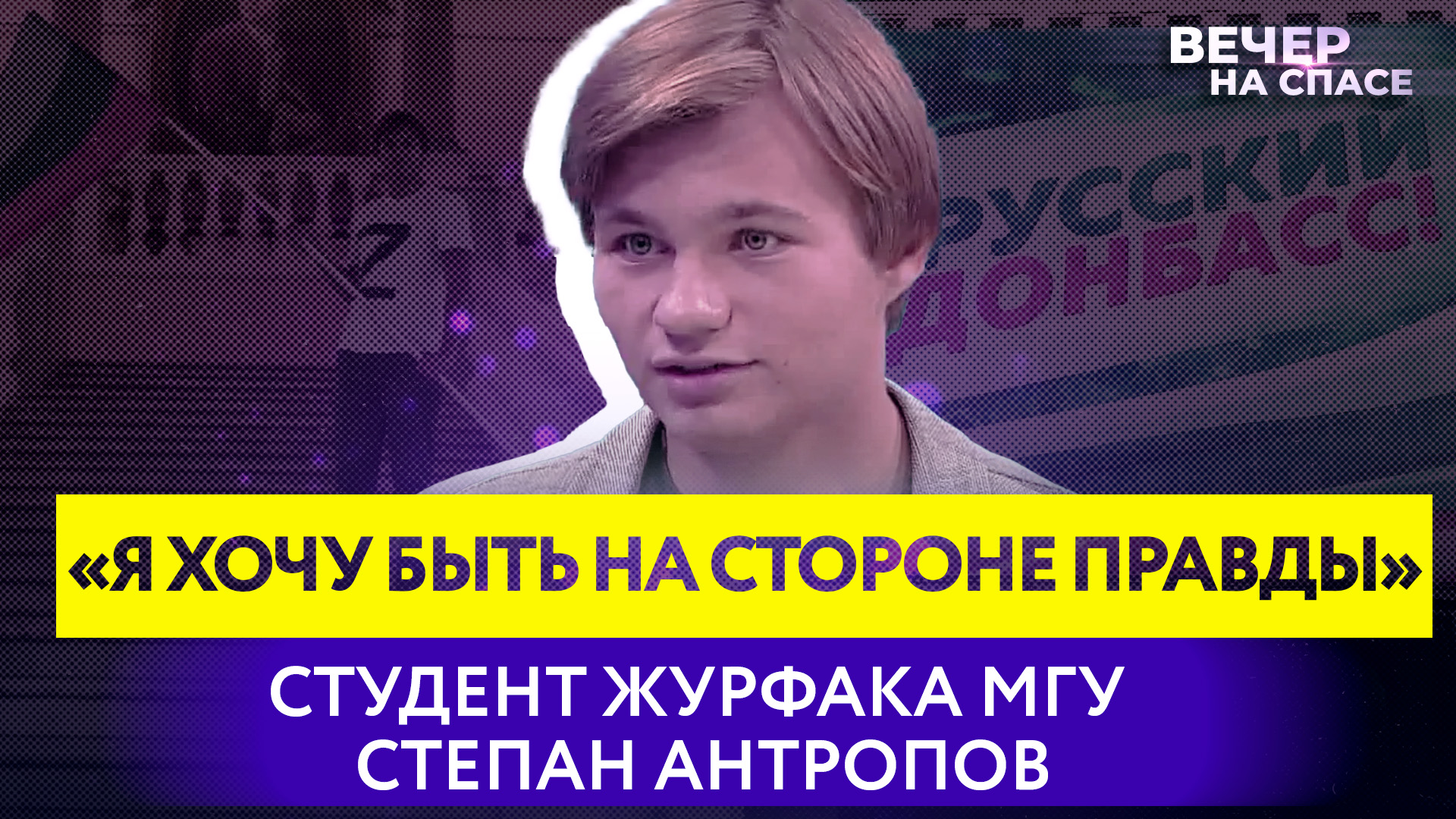 ⭕️ Подписывайтесь на наш RuTube канал ? Скандал в главном университете страны. Студент третьего курса факультета журналистики МГУ Степан Антропов пришел в альма-матер с флагом ЛНР и буквой Z на груди. ? У нас в гостях главный герой этой резонансной истории студент факультета журналистики МГУ СТЕПАН АНТРОПОВ ? Беседовал Андрей Афанасьев. Приятного просмотра! Это ВЕЧЕР НА СПАСЕ. 0:00 Приветствие. 0:50 Активная гражданская позиция. 2:40 Реакция на травлю. 5:12 Взгляды и воспитание. 6:52 Роль журналистики. 11:10 Информационная война. ______________ Подписывайтесь на нас во всех социальных сетях: https://tap.link/spas