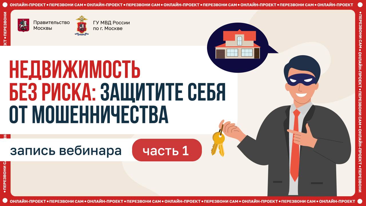 Как не стать жертвой мошенников при сделках с недвижимостью? Покупка, продажа и аренда жилья — это всегда важно, но, к сожалению, в этой сфере нередко действуют мошенники. Как не попасть в ловушку аферистов? На вебинаре “Недвижимость без риска: защитите себя от мошенничества” эксперты разобрали основные схемы обмана и поделились рекомендациями по защите. Спикеры: Эксперты Департамента информационных технологий Москвы Представители ГУ МВД России по городу Москве Специалисты рынка недвижимости Что обсудили: • распространенные приемы мошенников при купле-продаже и аренде жилья; • общие правила безопасных сделок; • на что обращать внимание при поиске недвижимости и как защититься от поддельных объявлений. Смотрите запись вебинара, чтобы защитить себя от мошенников! Поделитесь с близкими, чтобы предупредить их об угрозах. Хотите посетить следующий вебинар очно? Регистрируйтесь заранее на сайте “Перезвони сам” в разделе “Предстоящие вебинары”. https://sam.mos.ru/