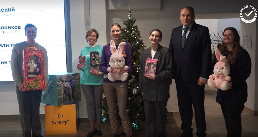 Секретарь Московского реготделения партии Петр Толстой передал новогодние подарки для детей жителей новых территорий России в штабе по сбору гуманитарной помощи «Москва помогает»