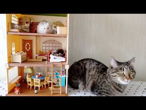 Хомяк хозяйничает в домике и пытается выбраться из него в то время как кошка наблюдает за порядком.......