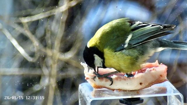 Синица в кормушке на окне зимой