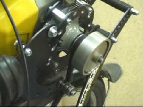 На видео представлен центробежный клиновой шкив-вариатор,устанавливаемый на велодвигателе мотовелосипеда, веломобиля, мотосамоката, также можно применять к электромоторам элекстровелосипедов. Осуществляет передаточное отношение в диапазоне от 1:15 до 1:30 Вариатор автоматический, реагирующий на число оборотов двигателя, связанные с нагрузкой.