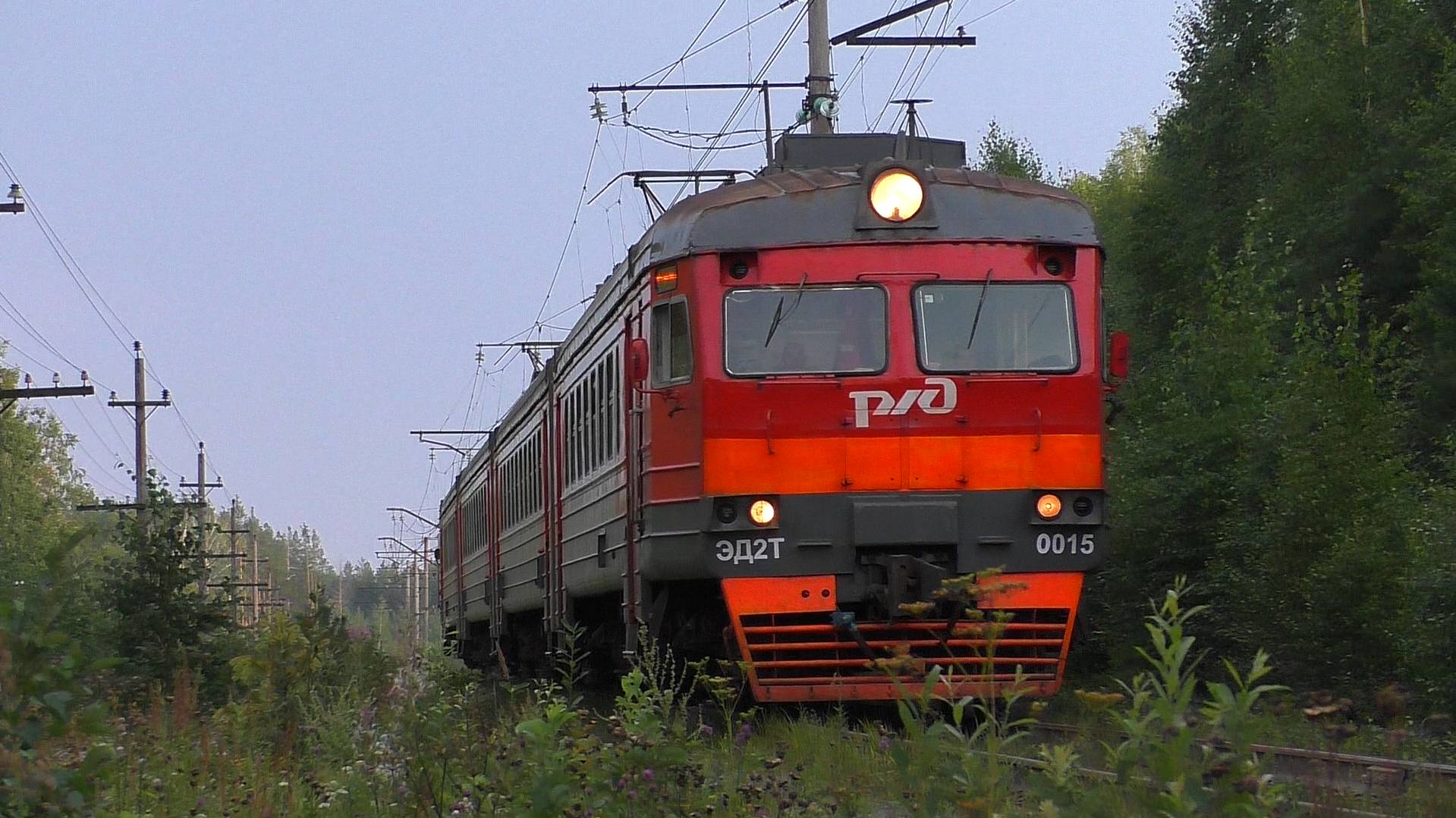 Электропоезд ЭД2Т-0015 сообщением №6895/6896 Егоршино - Нижний Тагил следует по перегону Разъезд 132 км - Алапаевск. Свердловская ЖД. Свердловская область, Россия. Приписка: ТЧ-11 Нижний Тагил (МВПС). 07.08.2020