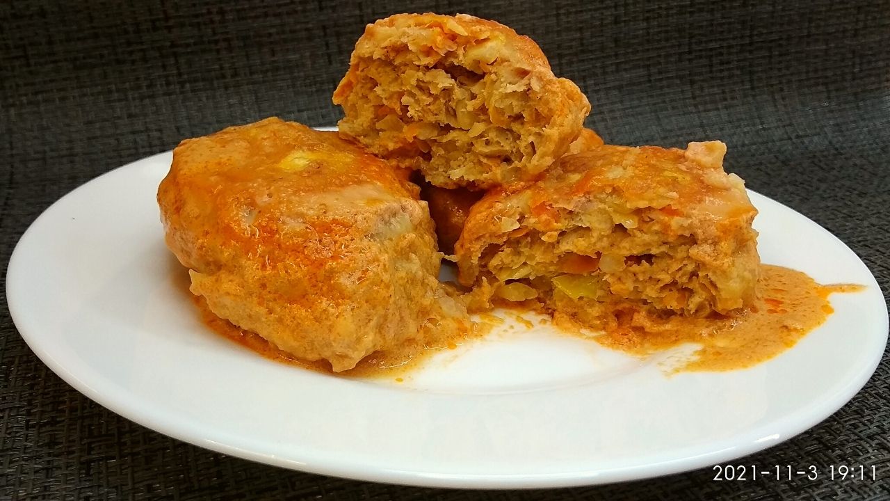 Рецепт: - фарш любой - 300г - рис отварной - 150г - капуста - 150г - лук - 1 шт. - морковь - 1 шт. - масло растительное для жарки - 2 ст.л. - мука - 2 ст.л. Соус: - томатная паста - 1 ст.л. - сметана - 3 ст.л. - вода - 1 стакан - соль по вкусу Голубцы уложить в форму, запечь 10 - 15 минут, затем вынуть из духовки, залить соусом и запекать до готовности. #голубцы #ленивыеголубцы #голубцывдуховке