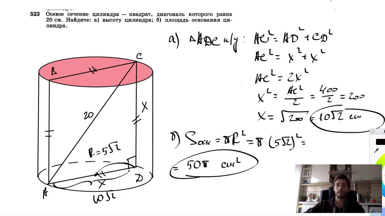 №523. Осевое сечение цилиндра — квадрат, диагональ которого равна 20 см. Найдите: а) высоту цилиндра; б) площадь основания цилиндра. Поддержать канал рублём - 5469400944002125 (Сбербанк) Мой второй канал для подготовки к ЕГЭ и ОГЭ - https://www.youtube.com/ЕвгенийСумин Инстаграм - https://www.instagram.com/EGE_OGE.math Личный инстаграм - https://www.instagram.com/ee_sumin VK - https://vk.com/evgeniysumin FB - https://www.facebook.com/EvgeniySumin